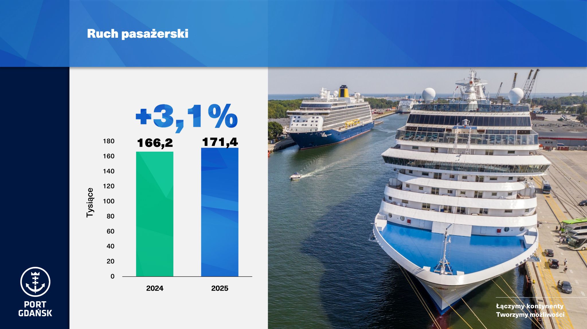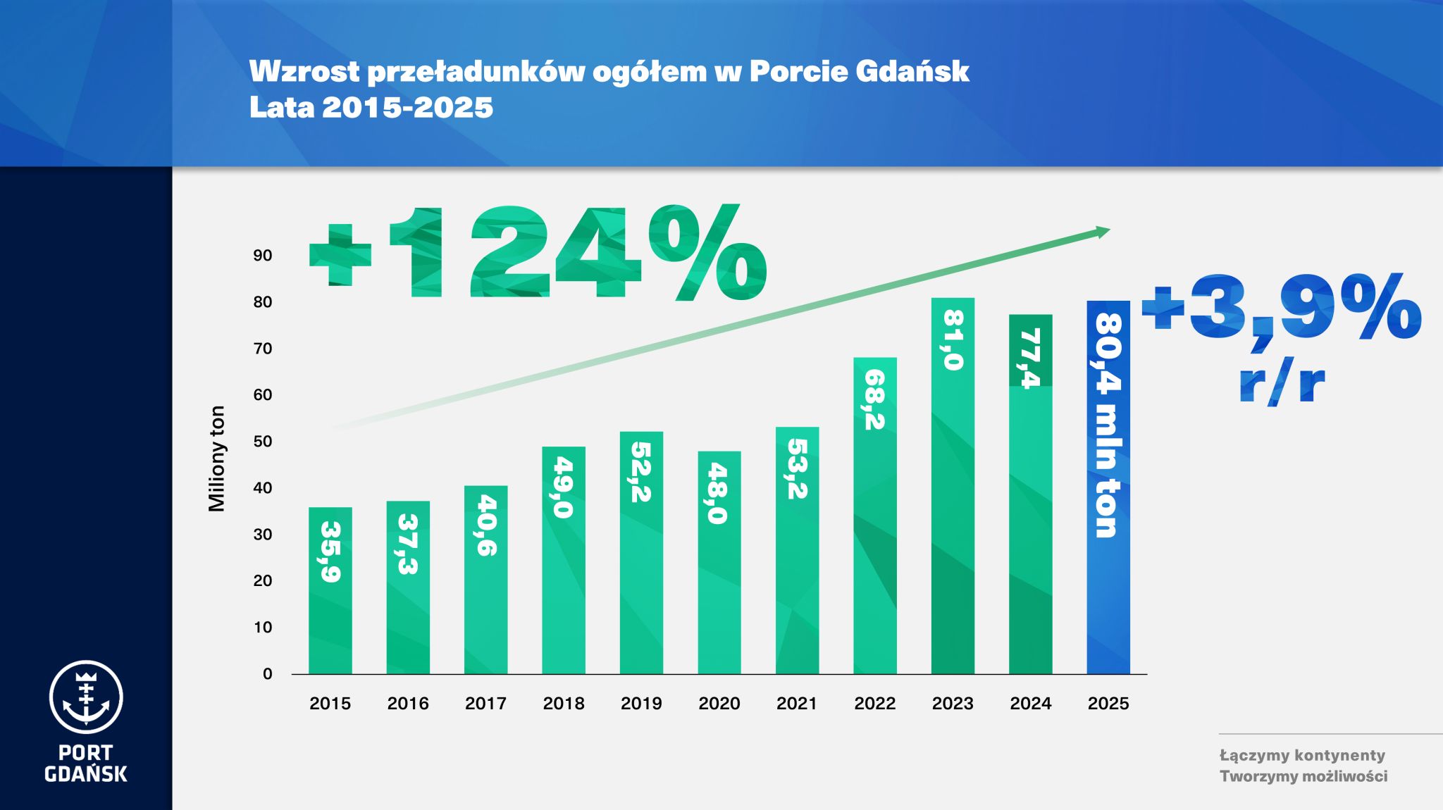 Port Gdańsk zakończył 2025 rok bardzo dobrym wynikiem przeładunkowym, potwierdzającym długoterminową tendencję wzrostową. W 2025 r. w największym polskim porcie morskim przeładowano łącznie 80,4 mln ton ładunków, co oznacza wzrost o prawie 4 proc. w stosunku do roku 2024, kiedy to wolumen przeładunków wyniósł 77,4 mln ton. Wynik ten jednoznacznie wskazuje, że Port Gdańsk pozostaje najdynamiczniej rozwijającym się portem regionu i strategicznym hubem transportowym dla rynków Europy Środkowej i Wschodniej.