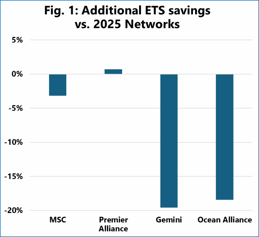 Armatorzy kontenerowi coraz wyraźniej dostosowują swoje siatki połączeń między Azją a Europą do nowych regulacji klimatycznych Unii Europejskiej. Jak wynika z analizy firmy badawczej Sea-Intelligence, nowe konfiguracje serwisów planowane na 2026 rok zmniejszają dystans objęty opłatami emisyjnymi w ramach systemu EU ETS średnio o około 11 proc. w porównaniu z siecią połączeń funkcjonującą w 2025 roku.